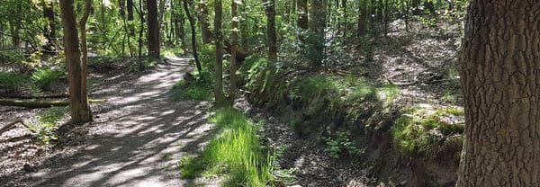 Bij de Leisloot, een oude afwateringssloot, zie je veel grillig uitgegroeide eiken. In het verleden legden de boeren vaak eikenbosjes aan omdat ze het hout goed konden gebruiken als brandstof en voor afrasteringspalen. De schors van eikentakken was veel geld waard aangezien het de grondstof leverde om leer mee te looien. De dichte eikenhakhoutbosjes boden ook een redelijke bescherming tegen het oprukkende zand. Tot vijftig jaar terug zag je hiervandaan de kale stuifzandheuvels van het Anserzand. Nu is het een geheuveld bos en heet dit gebied de Anserdennen. Als je deze route wil verlengen kan je even verderop de witte route volgen. Deze gaat ongeveer een halve kilometer rechtdoor naar het Theehuys Anserdennen. Vervolg na het Theehuys de witte route, die na ongeveer 2,5 km weer aansluit op de rode route.