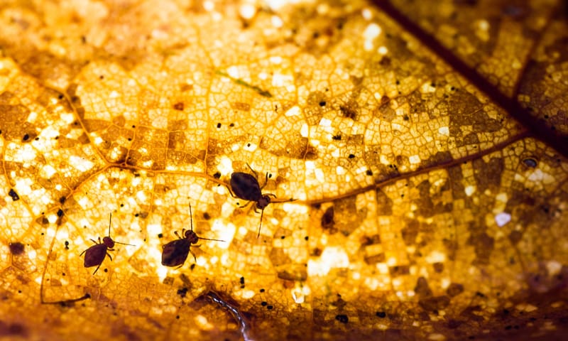 Springstaarten leven overal waar half verteerde bladeren op de bodem liggen. Deze kleine beestjes zijn fotografisch een echte uitdaging. Hier heeft de fotograaf ze slim met tegenlicht door zo’n blad heen gefotografeerd waardoor de contrasten lekker groot worden.