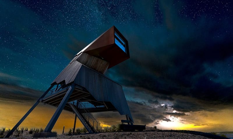 Deze foto van Frank Neefjes laat hemelse aspecten zien: avondrond, zonsondergang, wolken én sterren. Een bijzondere combinatie, gefotografeerd bij de uitkijktoren op Marker Wadden.