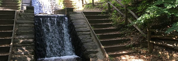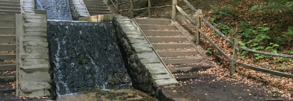 Hier zie je de grootste waterval van ons land. Het kletterende water maakt deel uit van een spreng (gegraven beek) die in 1869 werd aangelegd om het Apeldoorns Kanaal van voldoende water te voorzien. Onderweg werden stuwtjes en watervallen aangelegd om erosie te voorkomen.