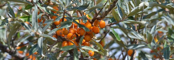 In het najaar en de winter eten kramsvogels en koperwieken hun buikje rond aan de oranje bessen van de duindoornstruiken op de dijk en op het groene strand. Duindoorn is van gescheiden geslacht. Dat betekent dat alleen aan de vrouwelijke struiken vruchten groeien. Het plantje kan goed tegen een zoute omgeving en stuiven van zand. Ben je een beetje culinair aangelegd, dan kan je met duindoorn lekkere jam of sap maken. Konijnen- en hazensporen zul je hier regelmatig zien. Op sommige plekken houden ze de planten kort. en geeft enkele zeldzame planten een kans zoals dwergvlas.