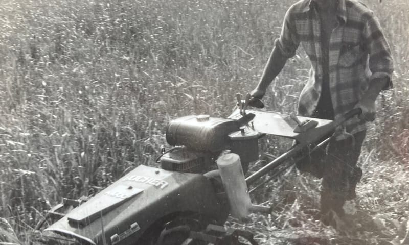 Dit is een van de eerste foto's van boswachter Guus werkzaam voor Natuurmonumenten en met een eenassige maaimachine op de Vlietlanden aan het werk is. De foto dateert uit eind jaren zeventig. Bedrijfskleding werd nog niet verstrekt aan terreinarbeiders, alleen aan boswachters die herkenbaar moesten zijn. Ook het gebruik van gehoorbescherming was nog niet verplicht.