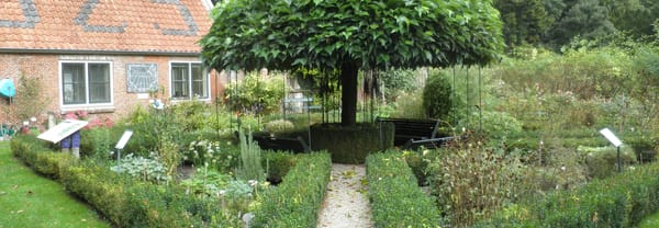 Je komt binnen bij de kruidentuin met perken vol keuken-, genees- en verfkruiden. Hier staan ook enkele potten met planten om aan te ruiken. In het midden staat een witte Moerbei, gesnoeid in de vorm van een parasol. Deze boom komt oorspronkelijk uit China en heeft zich over de hele wereld verspreid. De witte Moerbei is dé voedselboom voor de zijderups. De cocon die de rups spint om zich te verpoppen bestaat uit een zijdezachte witte draad en wordt gebruikt voor de productie van zijde. In sommige zijdeproducerende landen wordt de cocon met de vlinderpop gegeten als eiwitrijke snack.