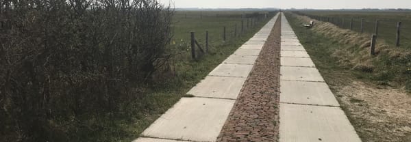 Je komt nu op de oude Motweg, een historisch stukje Texel. Vroeger was dit de verbindingsweg door Waalenburg, een echt paardenpad. De paarden liepen over de steentjes in het midden en de wielen van de kar in het karrenspoor ernaast. Dit soort paardenpaden komen op een paar plekken op Texel nog voor. In dit geval liggen er betonplaten naast zodat ook rolstoelgebruikers hier van de polder kunnen genieten.