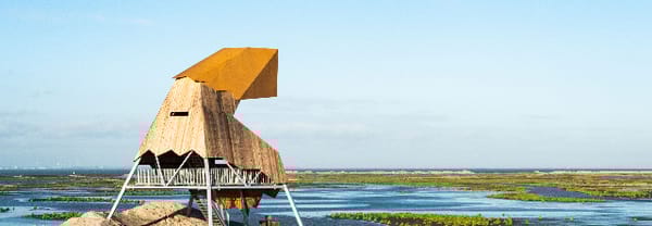 Een geweldig weids uitzicht heb je vanaf de Steltloper. Je kijkt over Marker Wadden en het Markermeer. Samen met de Oostvaardersplassen vormen ze Nationaal Park Nieuw Land.
